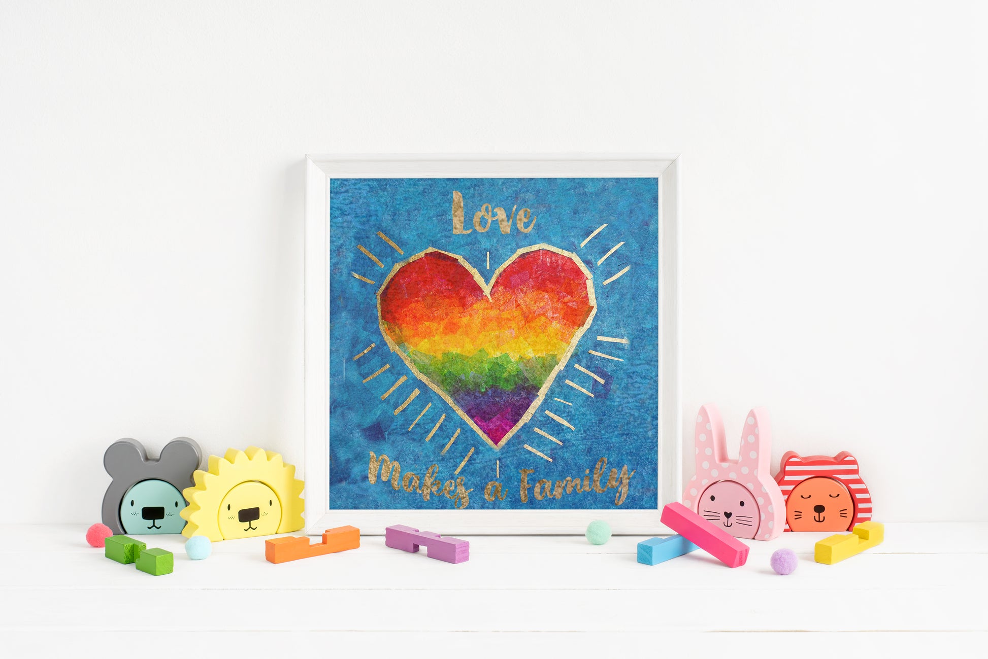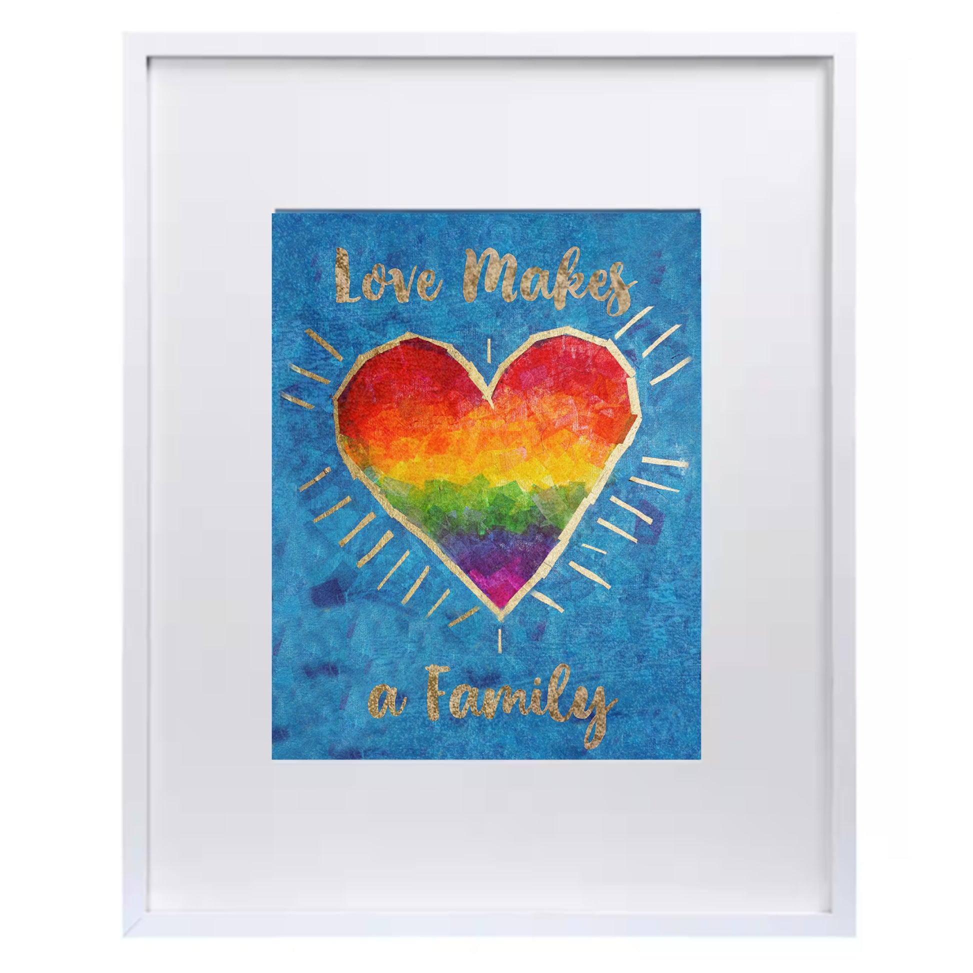 Share the foundational nature of love for a family. This "Love Makes a Family" print of a rainbow heart with gold accents makes a wonderful baby shower gift for a parent in search of a unique and colorful nursery or for those who have created families through adoption, fostering, or other non-biological means.