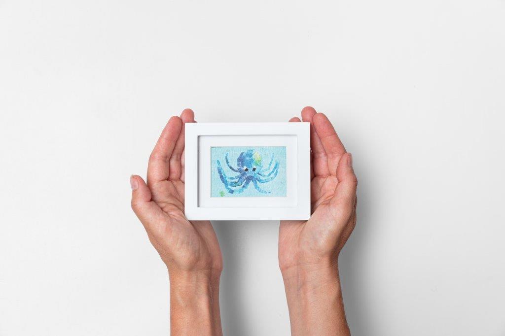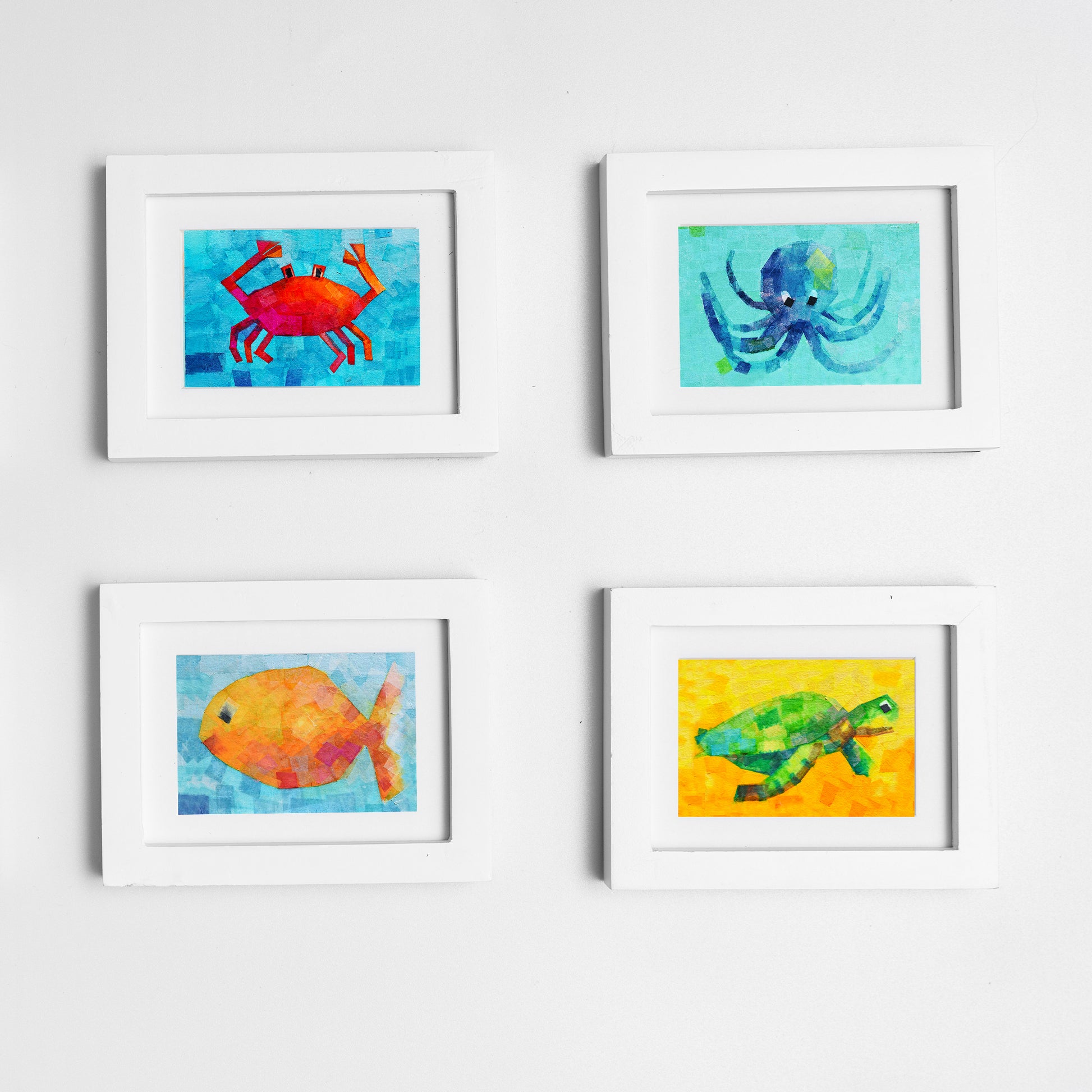 Images shown are examples of framed minis. The set comes with the images shown of sea turtle, goldfish, crab, and octopus.